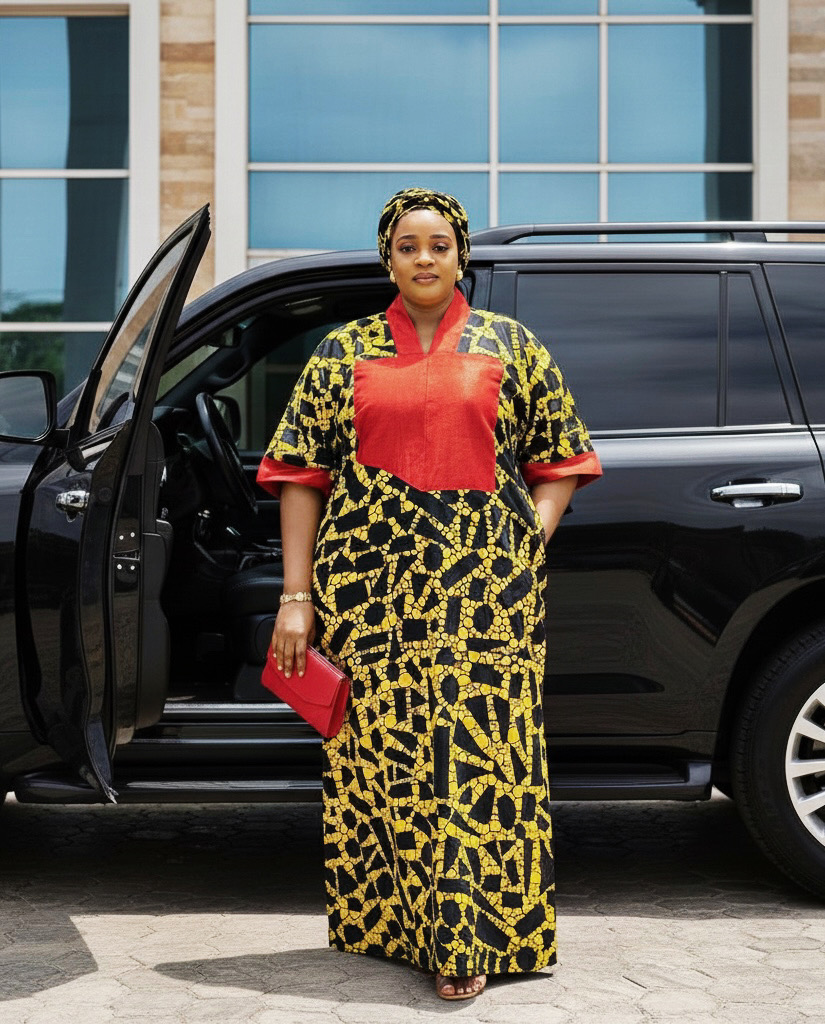 Stella maxi is a ready to wear kaftan in bright yellow ankara fabric and red quality asooke.
