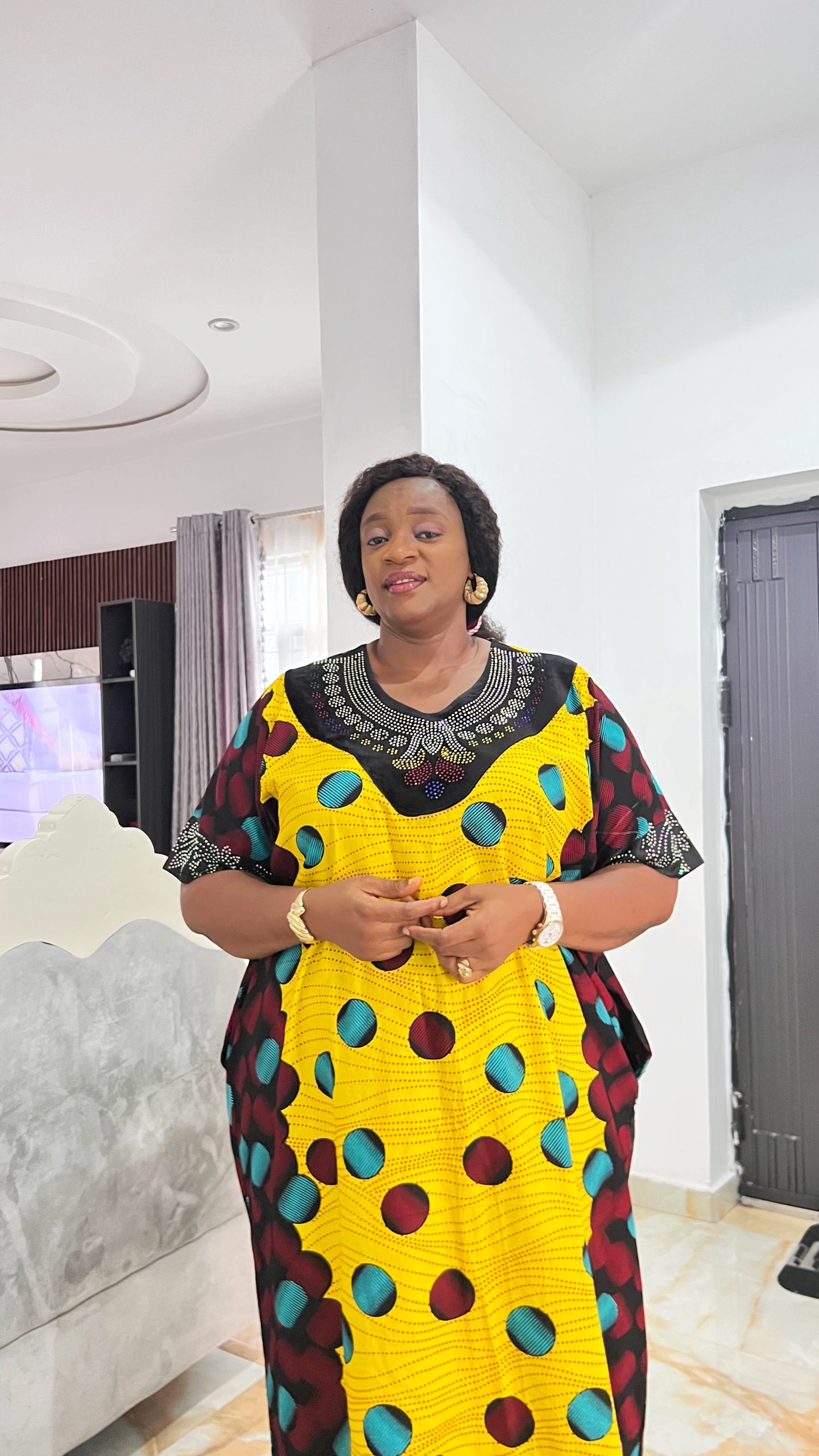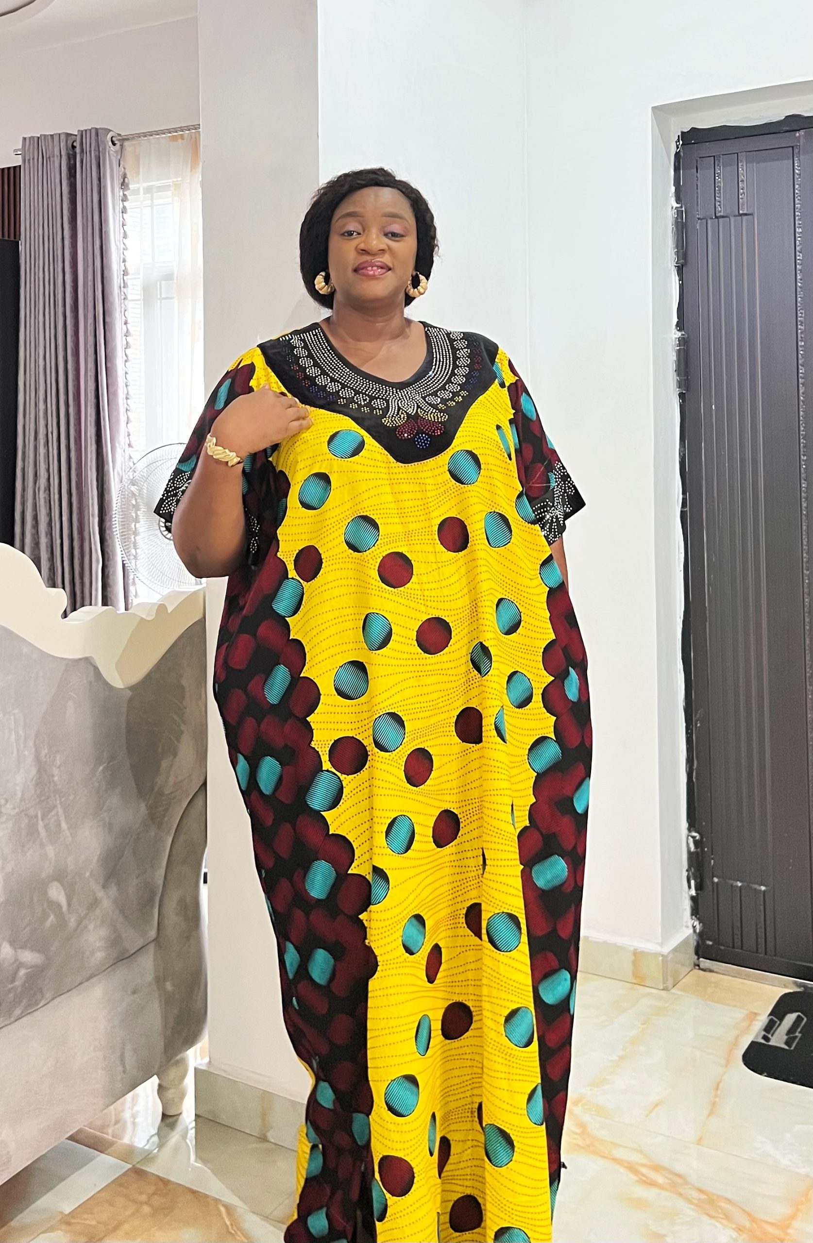 Stay stylish and comfortable in our vibrant one-size-fits-all bubu gown, designed to flatter plus-size figures. Crafted from breathable fabric, it features a colorful print with a relaxed fit. The neckline and sleeves are elegantly embellished with genuine Swarovski stones, adding a touch of sparkle. Perfect for casual outings, at-home elegance, or social gatherings